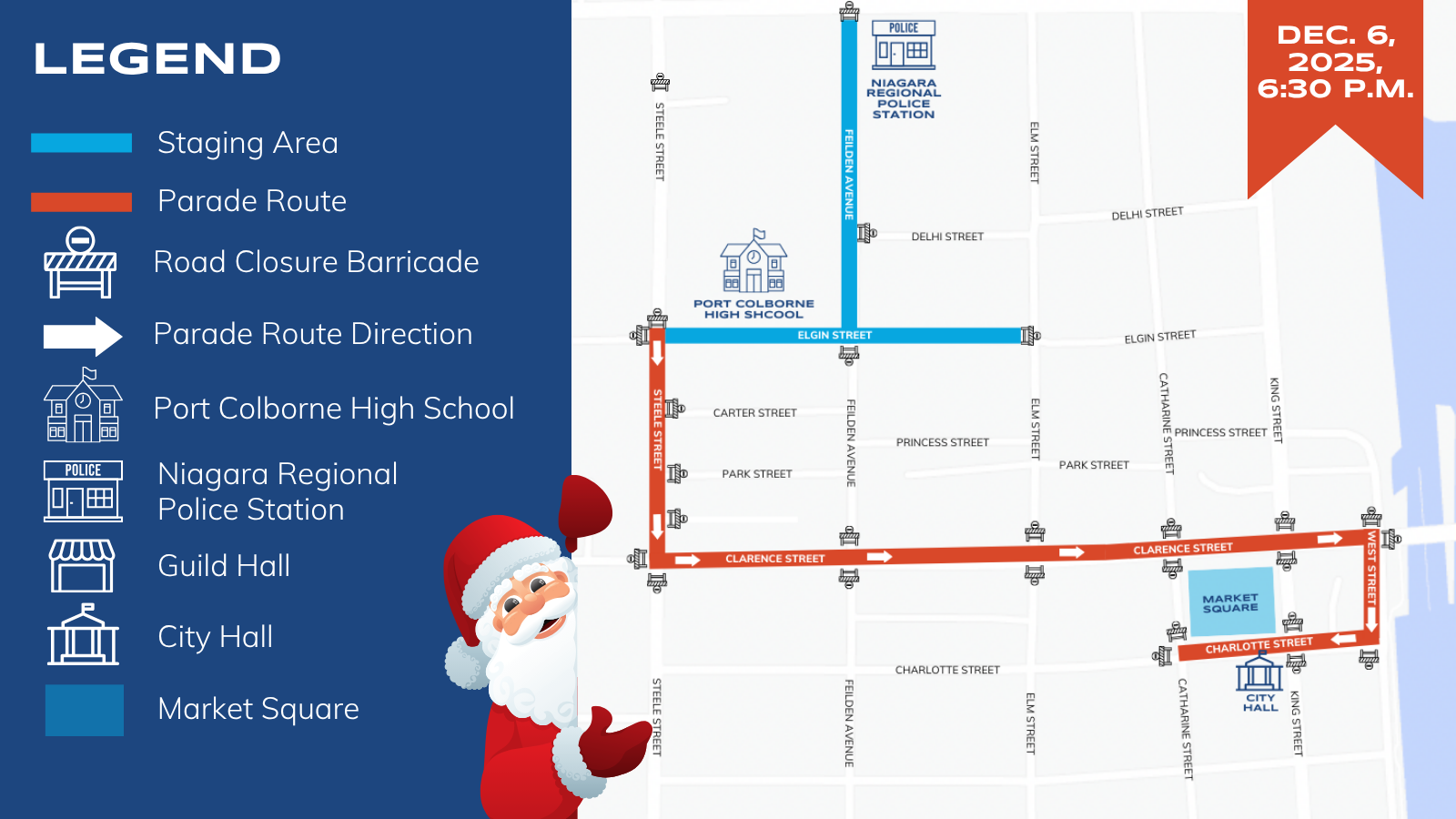 The City of Port Colborne is excited for the return of our traditional Lighted Santa Claus Parade in Port Colborne's downtown core. Port Colborne's Lighted Santa Claus Parade is always held the first Saturday in December. Join us on Saturday, December 6, 2025, at 6:30 p.m. and witness the streets of Port Colborne lit up by our local businesses, community groups, schools, and more.